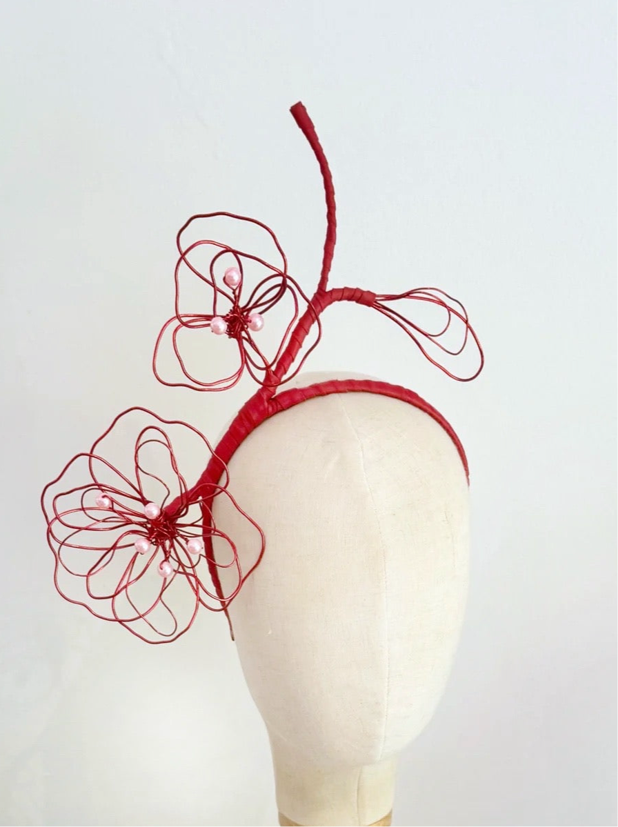 Red metallic wirework floral stem with pink beaded stamens , mounted on a slimline leather wrapped headband