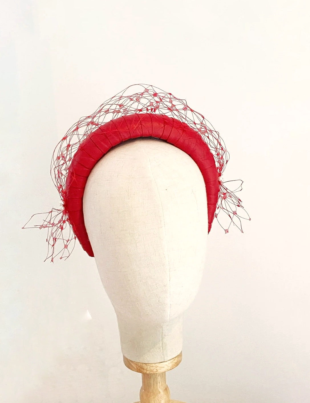 Amelia is a genuine leather wrapped padded band with veiling drape and 3 little pearl beads on either side .